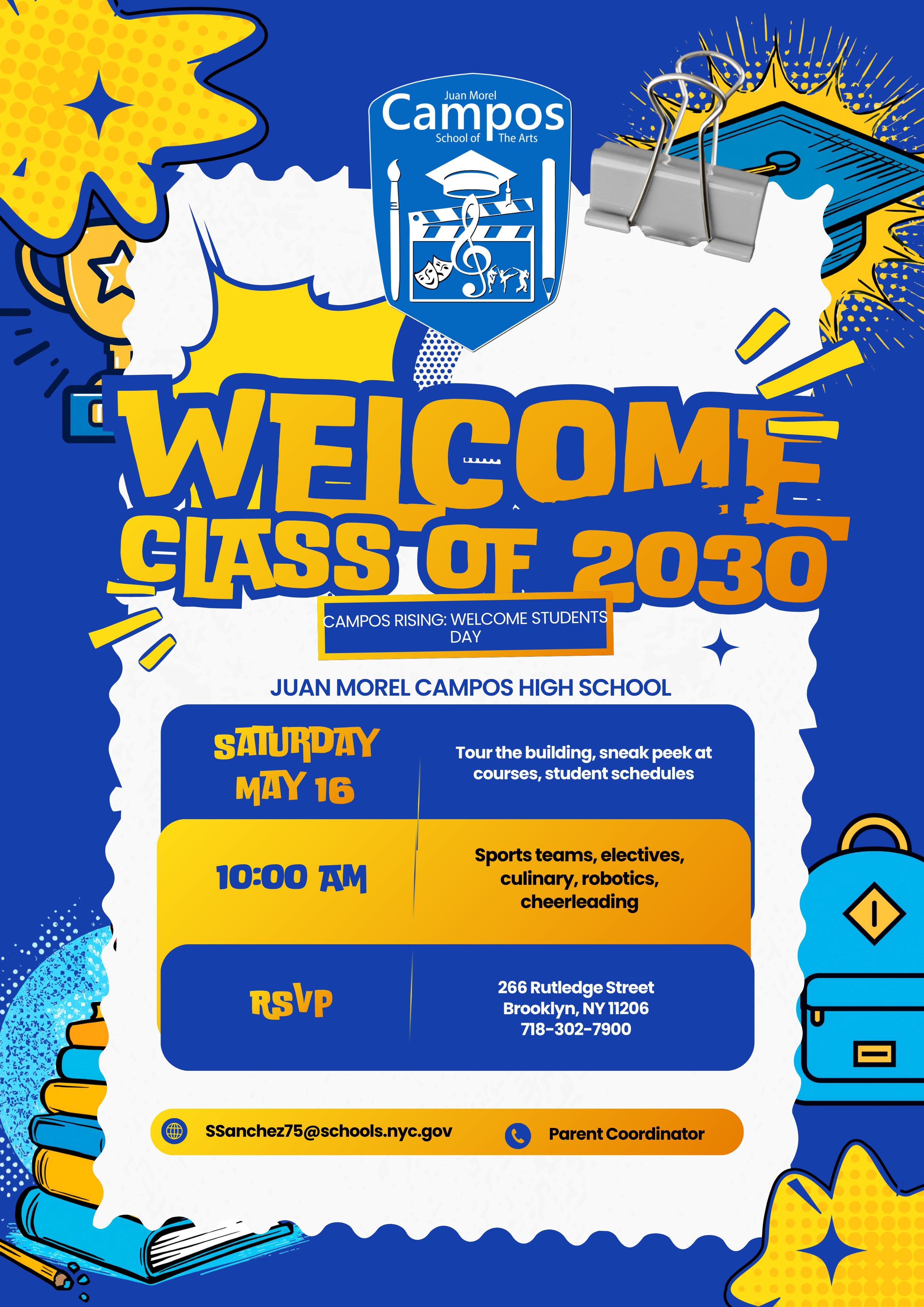Juan Morel Campos High School is excited to welcome the Class of 2030. Families are invited to join us on Saturday, May 16 for Campos Rising: Welcome Students Day, featuring building tours, program previews, and a look at the sports, arts, and electives that make our school shine. We can’t wait to meet our future Campos scholars and celebrate the start of their journey.